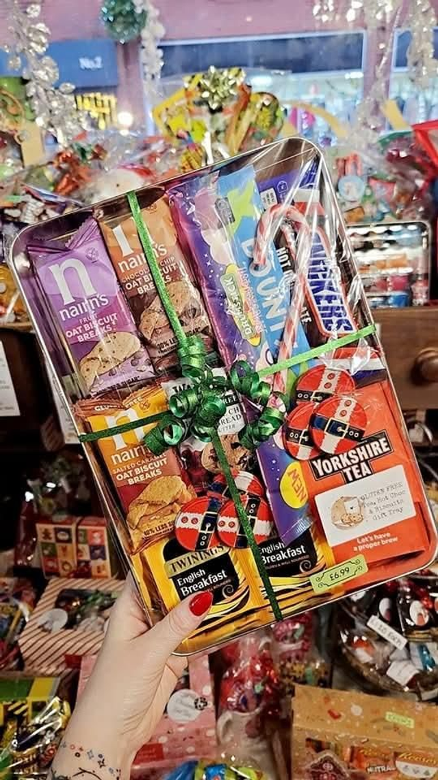 Gift tray crammed full of various flavoured hot chocolates, plus teabags and gluten free biscuits!