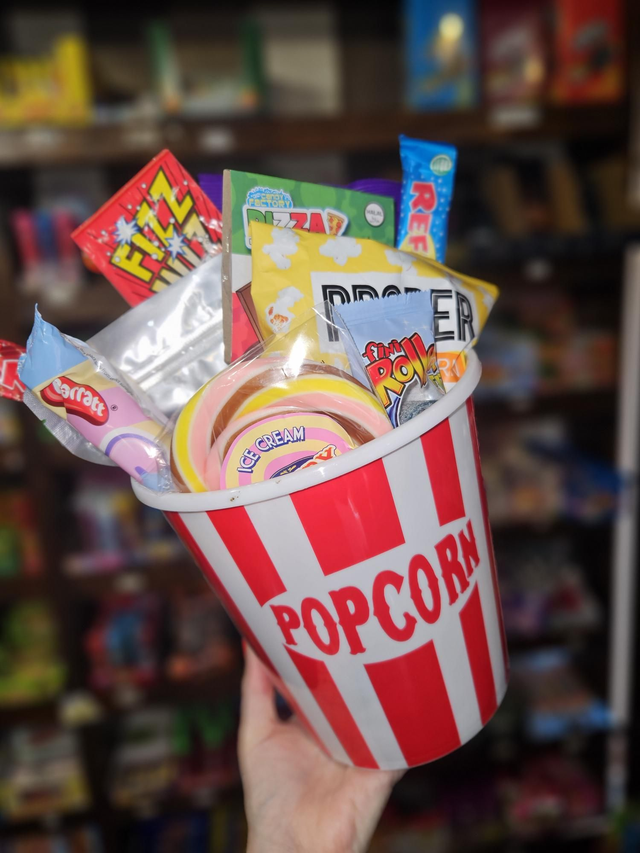 Containing crisps, popcorn , 500g gummy mix and lots of other goodies these have all you need for the perfect movie night treat ! Compelte with reusable popcorn bowl !